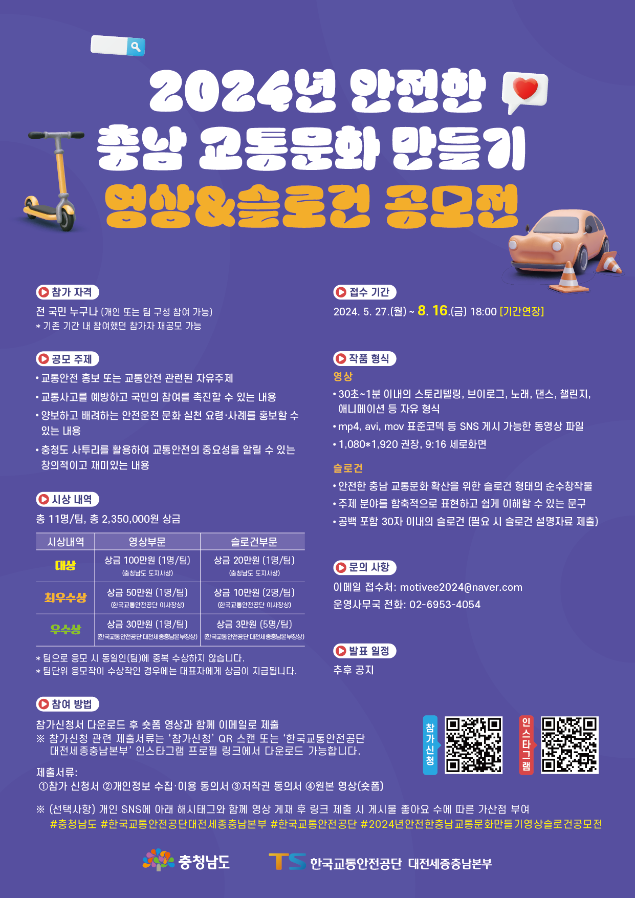 ※ 참가신청 관련 제출서류는 '참가신청' QR 스캔 또는 '한국교통안전공단 대전세종충남본부' 인스타그램 프로필 링크에서 다운로드 가능