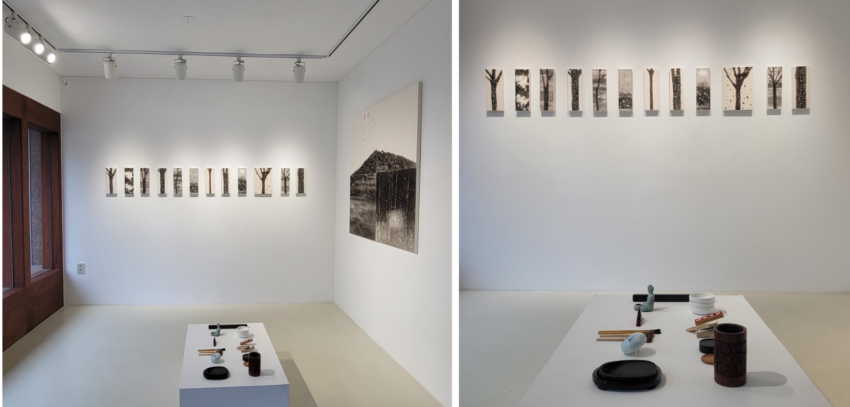 전시 제목인 ‘비 오는 770km의 풍경’은 공주문화예술촌 레지던시 작가로 입주하면서 고향-직장-경유지-거주지를 왕복하는 누적된 거리를 의미하며 작품에 자주 등장하는 나무는 한자리에 뿌리내리고 살아가는 존재로 정착하기를 바라는 동경이 담겨 있습니다.