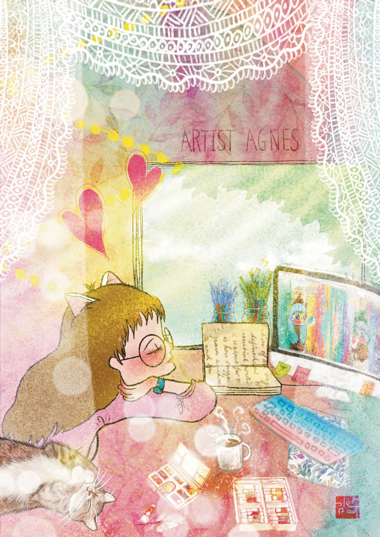 그리고, 그림쟁이 김안예.아녜스 저만의 브랜드로 저만의 그림을 활용한 굿즈를 만들고, 아이들과 함께 어른들도 즐겨 볼 수 있는 어른을 위한 동화책 작가활동도 하고 싶어요..요즘은 특히 그림책 삽화 작업, 그림책 작업하는 것에 관심이 많아서, 작업을 하고 있습니다.