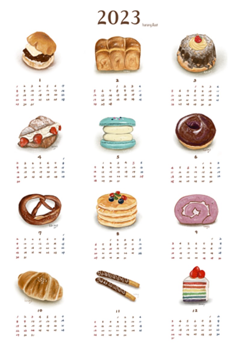 우선 빵 달력을 제작하기 위해 빵 일러스트 작업을 했고 가게 로고 작업도 의뢰 받아 진행했습니다.